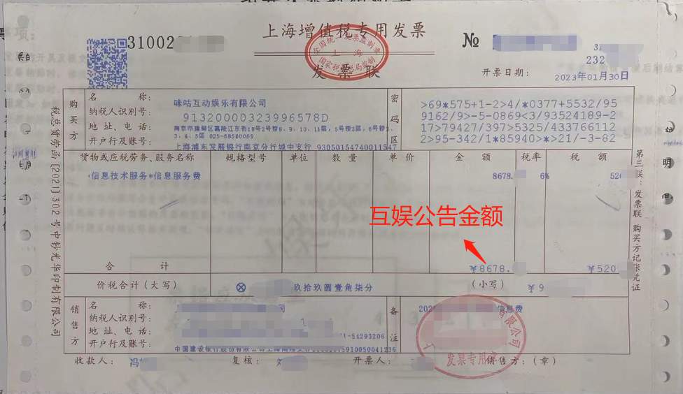 【纸质发票】寄送地址:江苏省南京市建邺区嘉陵江东街18号南京游戏谷6栋咪咕互动娱乐有限公司 前台-结算管理组 收 电话:025-68560069(仅供快递使用,请勿咨询) 邮编:210041