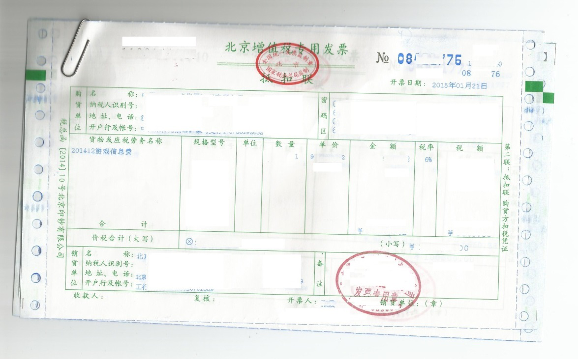 1、开票项目:项目名称原则上应开具为“游戏信息费” (“增值电信服务费”、“技术服务费”、“信息服务费”、“信息技术服务费”均可),对应账期请在备注栏和发票粘贴单中填写。 部分省份开票项目名称中已无“费”字,该情况不影响结算。因税务系统升级,开票内容需增加税收分类编码,建议选择选择【*信息技术服务*】或者【*增值电信服务*】。(见附录一:发票开具示例)